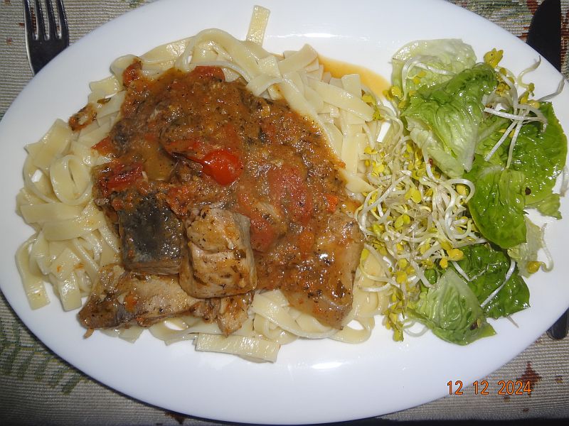 | | Karpfen mit Tomaten-Basilikum-Soße, Pasta, Salatherzen mit Sprossen |
