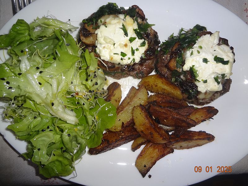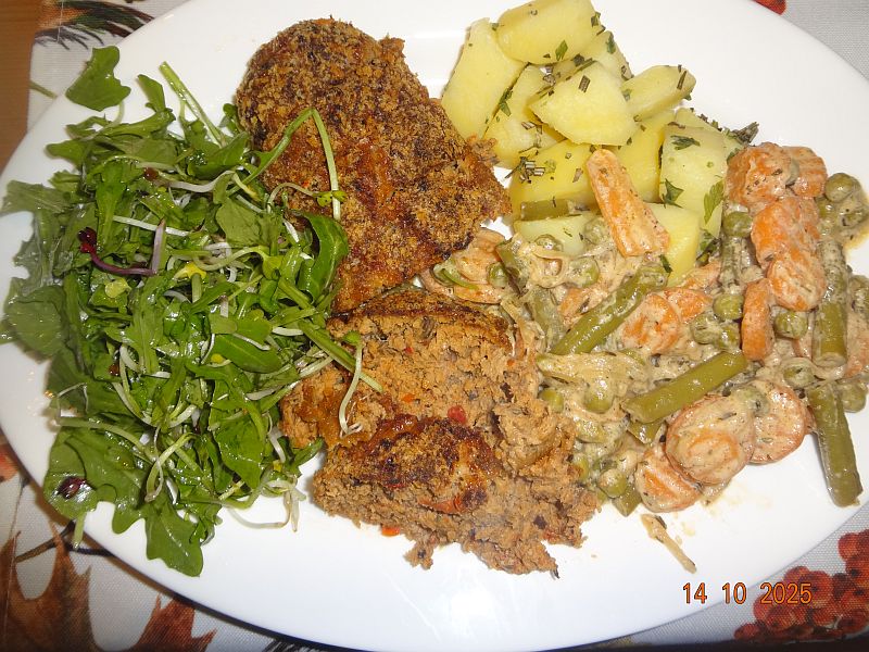 | | Pilz-Fleisch-Klopse mit Käse und Schmand, gebratene Kartoffelspalten, Eichblattsalat mit Alfalfa- und Rettich-Sprossen |