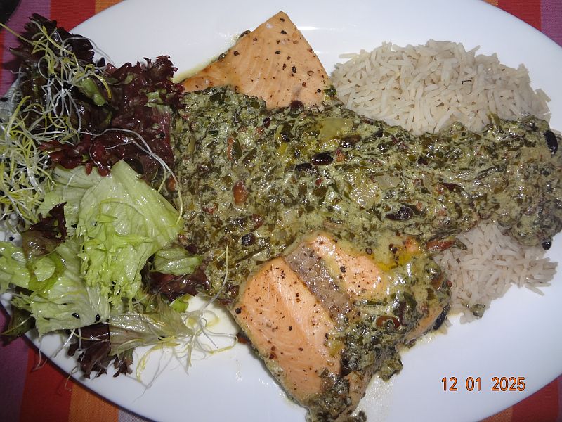 | | Lachsfilet, Spinat, Reis, Lollo-Rosso-Salat mit Sprossen |