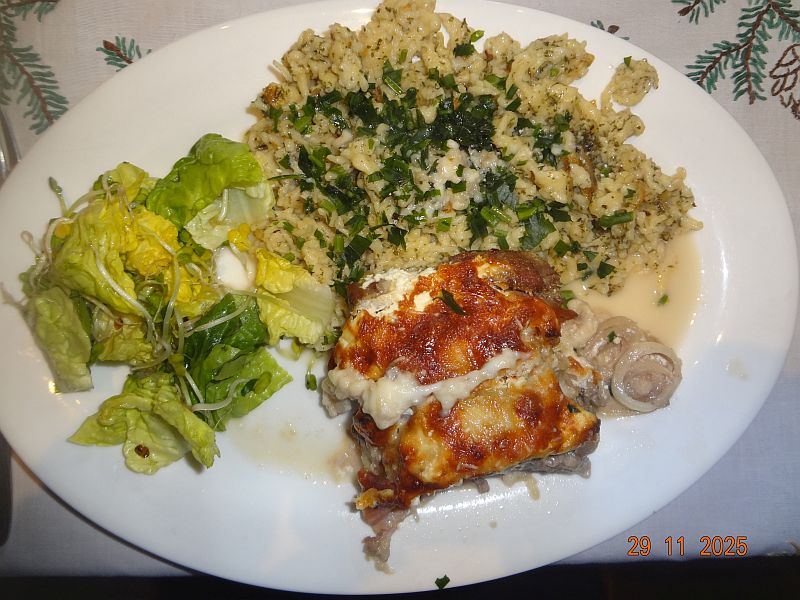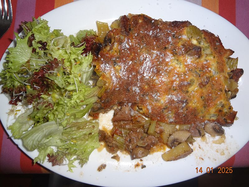 | | Schichtauflauf mit Kart., selbstgeräuchertem Lachs, Champignons und geriebenem Käse, Feldsalat mit Sprossen |