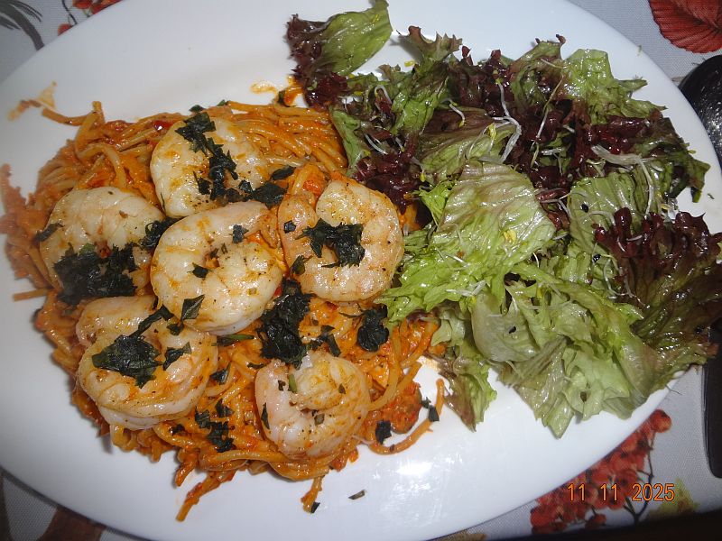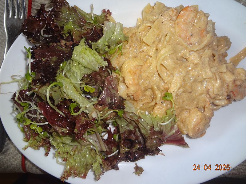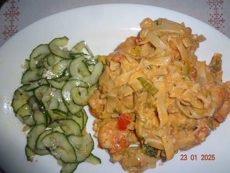 | | Tagliatelle mit Garnelen, Kaisergemüse, Tomaten-Schmand-Soße, Gurkensalat |