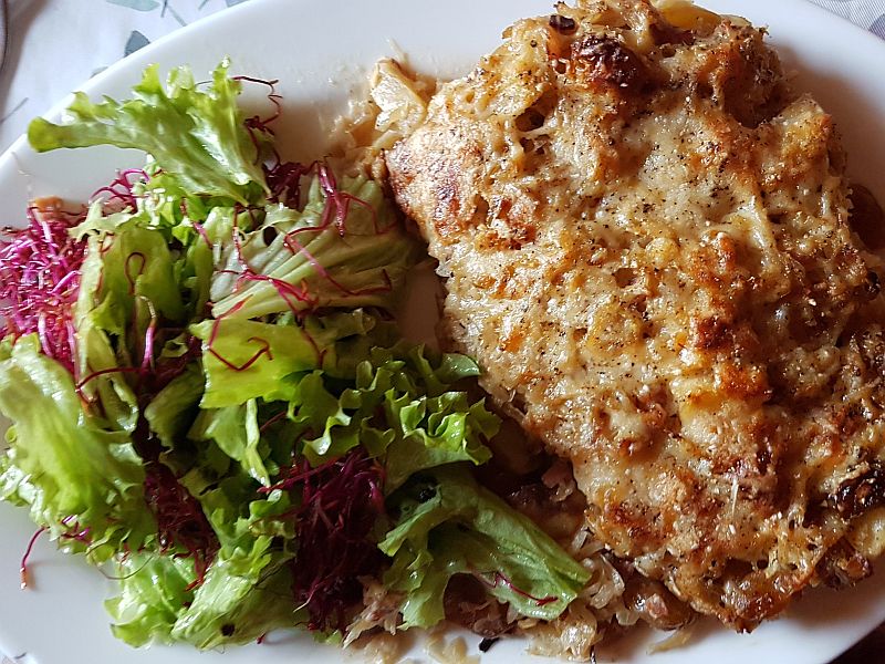 | | Kasseler, Sauerkraut mit Rum-Rosinen, Apfel und Schmand, mit Käse überbacken, Frisée-Salat mit Rotkohl-Sprossen |