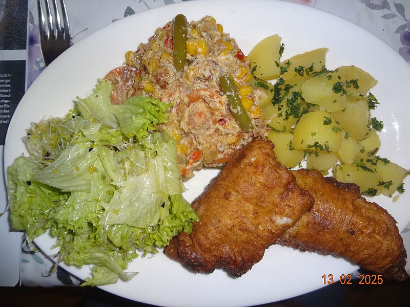 | | Paniertes Hähnchenbrust-Filet, gemischtes Gemüse mit Waldpilzen, Pet.-Kart, Rucola-Salat mit Radieschensprossen |
