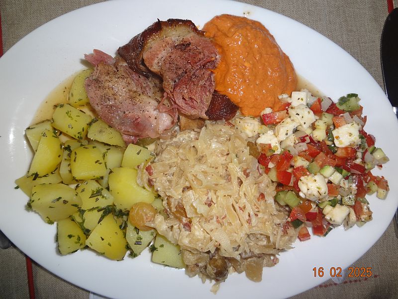 | | Eisbein, Rumrosinen-Sauerkraut, Dip, Pet.-Kart., Gemüse-Mozzarella-Salat |
