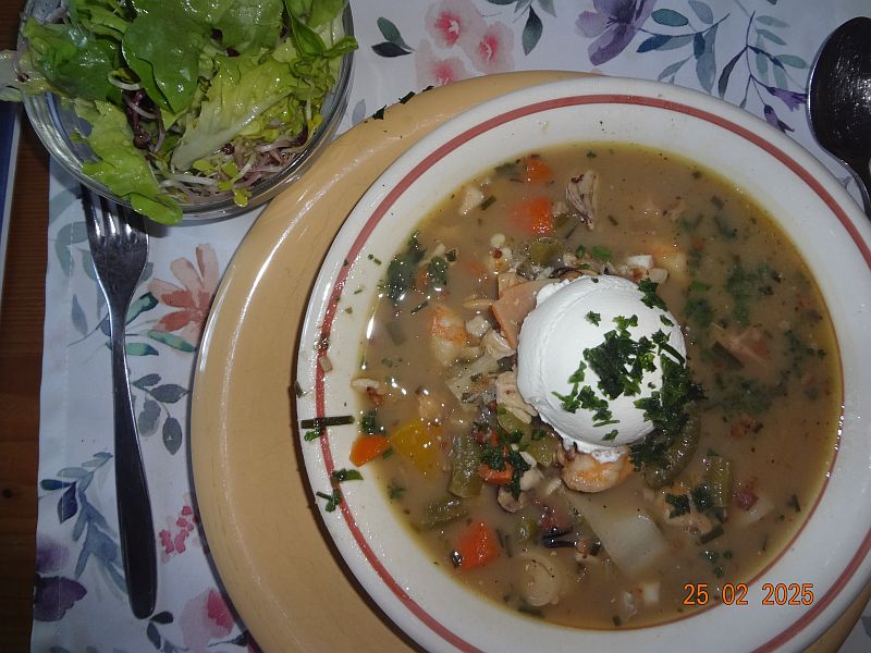 | | Eintopf in Rinderbrühe mit Bratwurst-Würfeln, Garnelen, Waldpilzen, gemischtem Gemüse, Bacon, und Zwiebeln (*), Eisbergsalat mit Kräutern der Provènce |