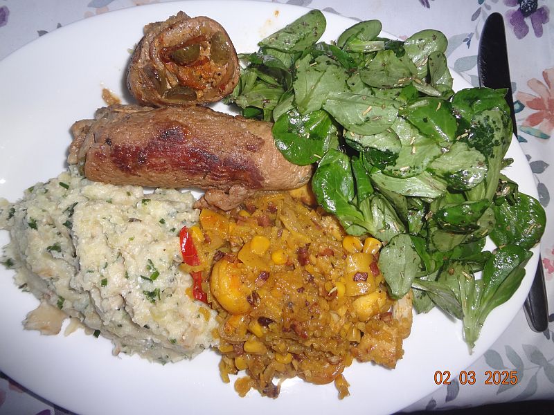 Schweinenacken-Rouladen, Paella-Rest, Kart.-Sellerie-Stampf, Feldsalat mit Kräutern der Provence |