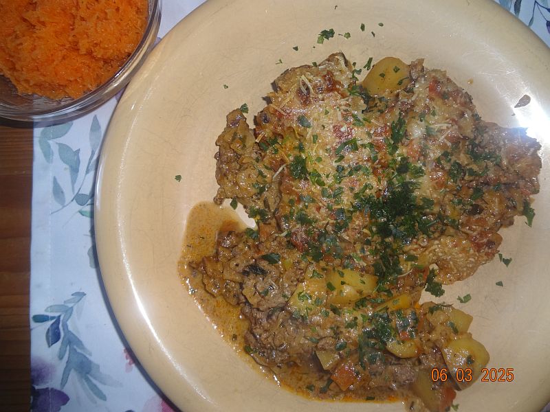 | | Käse-überbackener Kart.-Auflauf mit Lamm-Hackfleisch, Möhrensalat |