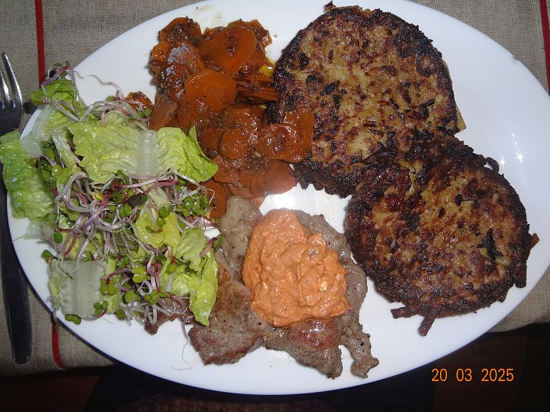 | | Nackensteak, Tomaten-Schmand-Ajvar-Dip, Apfel-Zwiebel-Ei-Rösties, gehobelte Vanille-Möhren, Salatherzen mit China-Rose-Sprossen |