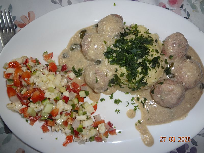 | | Königsberger Klopse in Kapern-Soße, Kart.-Sellerie-Stampf, Gemüsesalat mit Mozzarella |