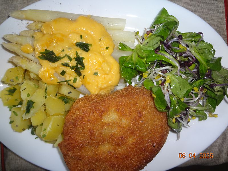 | | Panierte Hähnchenbrust-Filets, Spargel mit selbstgemachter holländischer Soße, Pet.-Kart., Feldsalat mit Rotkohl-Sprossen |