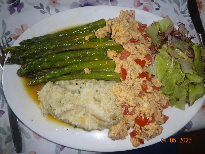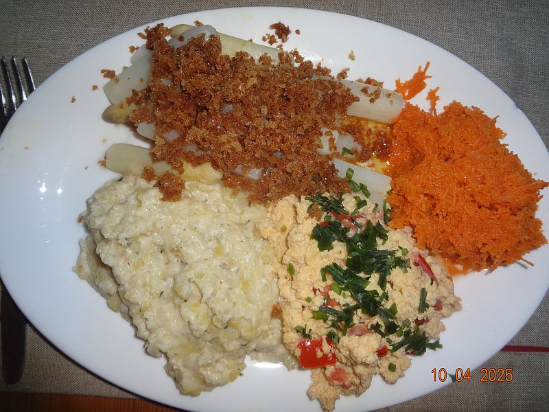 | | Rührei a la Opa, Kart.-Sellerie-Schmand-Stampf, Spargel mit Panko-Bröseln, Möhrensalat |