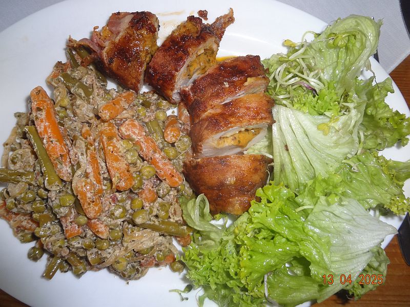 | | Mit Frischkäse gefülltes Hähnchenbrust-Filet im Speckmantel, Möhren-Erbsen-Bohnen in Sekt-Schmand-Soße, Lollo-Bionda-Salat mit Radieschen-Sprossen, Honig, Apfelessig und Ernussöl |