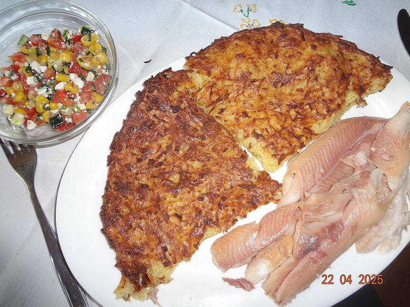 | | Kartoffel-Torte, selbstgeräucherte Forelle, Paprika-Mais-Feta-Salat |