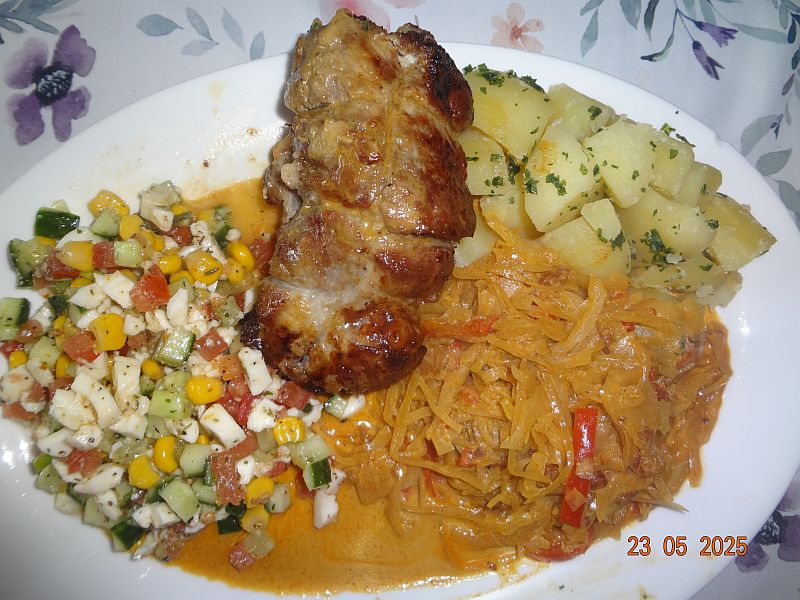 | | Schweinenacken-Roulade, Weißkohl mit Paprika-Streifen, Pet.-Kart., Tomate-Gurke-Mais-Salat mit Mozzarella |