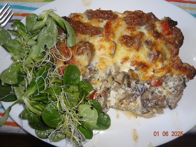 Gyros-Auflauf mit Champignons, Feldsalat mit Porree-Sprossen |