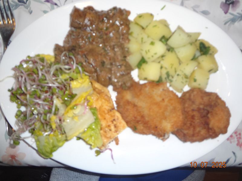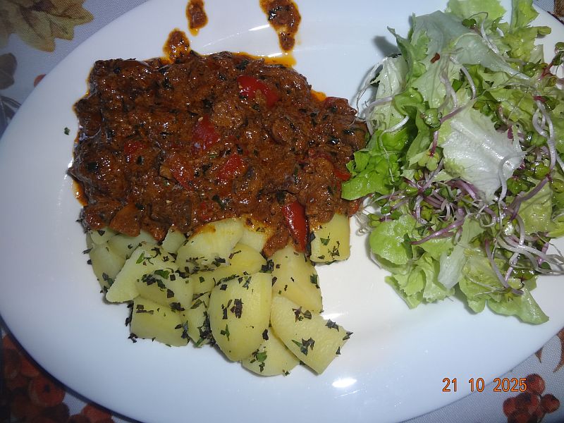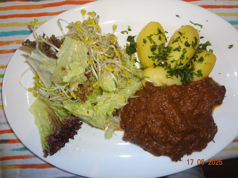 | | Rindergulasch a la Opa, Pet.-Kart., Lollo-Rosso-Salat mit Radieschen-Sprossen |