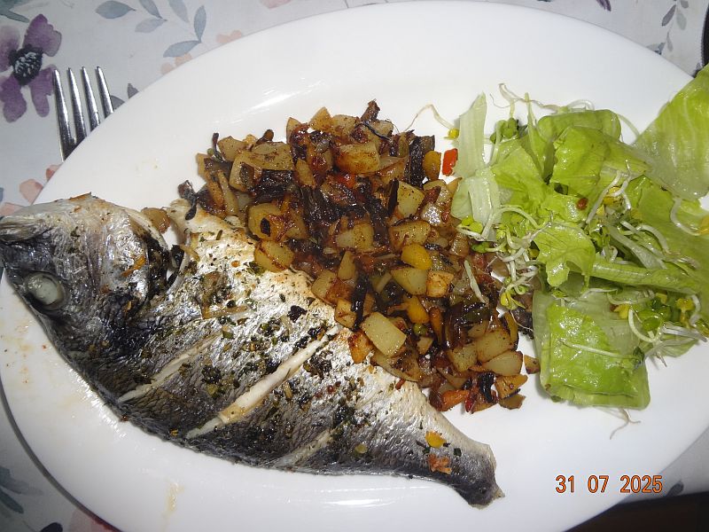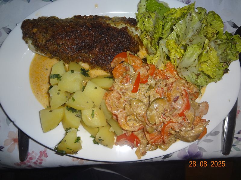 | | Kräuter-Dorade mit Kart. und Möhren, Gemüse-Salat mit Mozzarella |