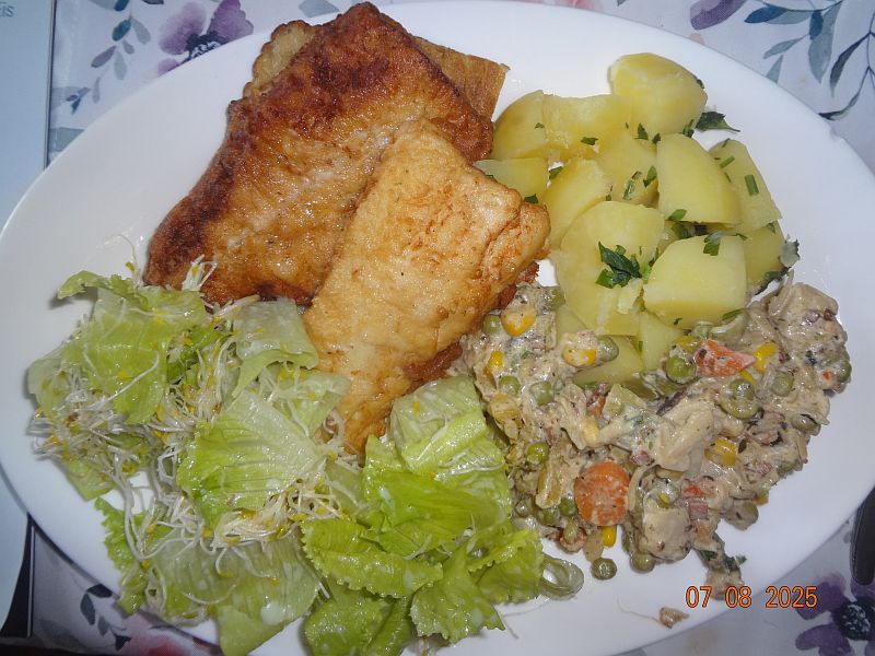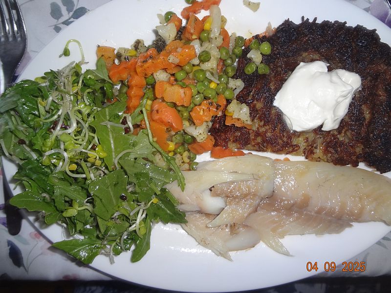 | | Zanderfilet im Schlafrock, gemischtes Gemüse mit Sekt-Schmand-Soße, Pet.-Kart., Crispana-Salat mit Rettich-Sprossen |