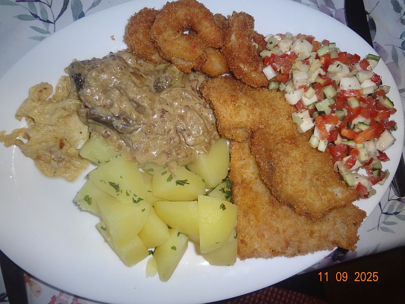 | | Rotbarsch-Filet und Garnelen, paniert, Waldpilze in Käse-Sekt-Schmand-Soße, (*), Pet.-Kart., Gemüse-Mozzarella-Salat |