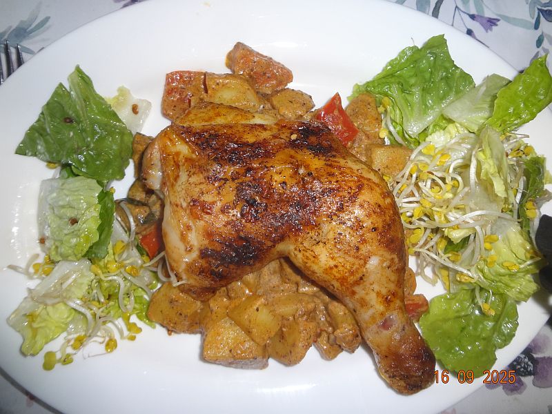 | | Hähnchen-Schenkel aus der Heißluft-Fritteuse, Farmers-Gemüse mit Sekt-Schmand-Creme, Pet.-Kart. mit Sellerie, Rukola-Salat mit Sprossen |