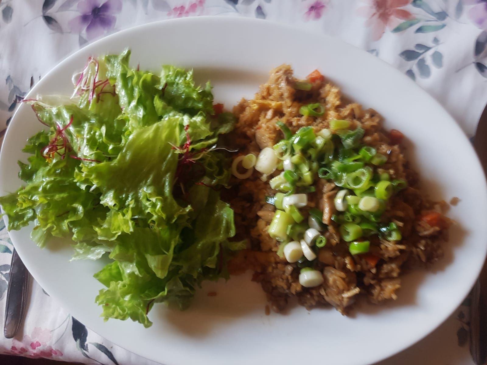 | | Nasi Goreng mit mit Hähnchen aus dem Woke, Lollo-Bionda-Salat mit Rote-Bete-Sprossen |