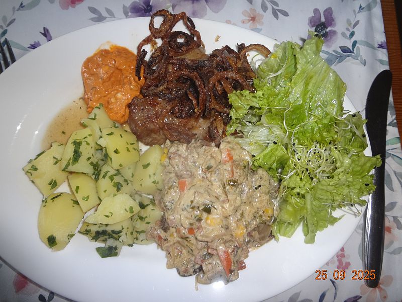 | | Nackensteak, Ajvar-Tomatenmark-Schmand-Dip, Pilz-Gemüse in Sekt-Schmand-Soße, Pet.-Kart., Lollo-Bionda-Salat mit Alfalfa-Sprossen |