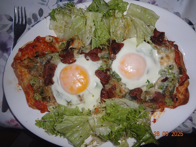 | | Flammkuchen mit ATS-Dip, Lauchzwiebeln, Bacon und Ei, Lollo-Bionda-Salat mit Alfalfa-Sprossen |