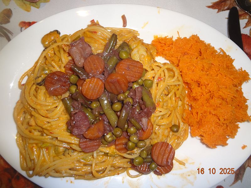 | | Spaghetti mit Garnelen und Meeresfrüchten in Tomaten-Ajvar-Schmand-Soße, gemischtes Gemüse, Möhrensalat |
