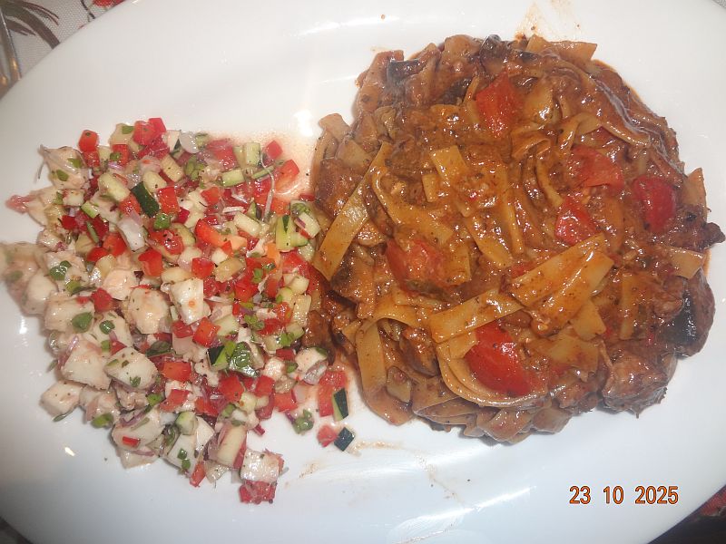 | | Tagliatelle mit Fisch, Meeresfrüchten und gemischtem Gemüse, Weißkohl-Salat mit Paprika-Streifen |