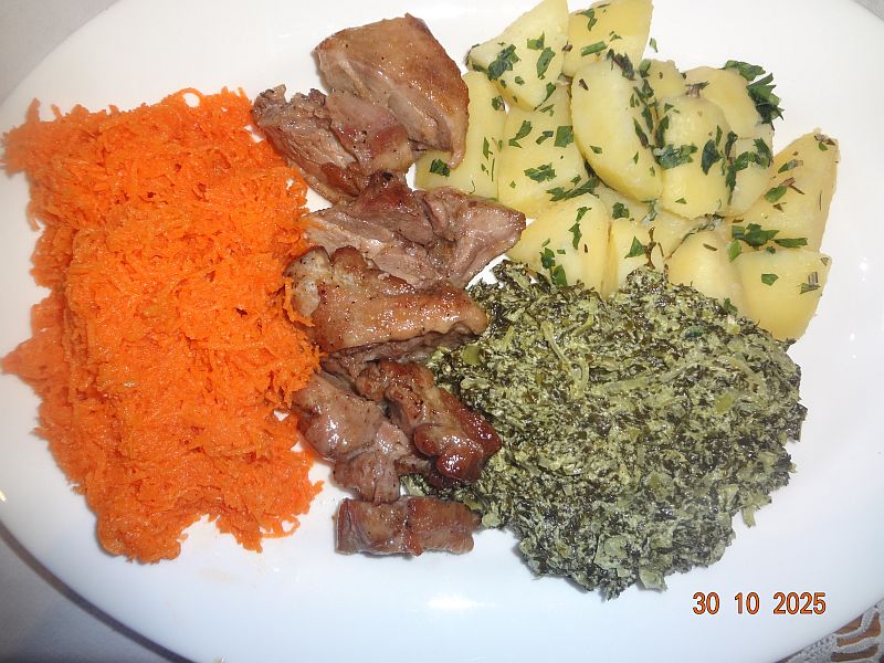 | | Filetierte Entenkeule, Grünkohl, Pet.-Kart., Möhrensalat |