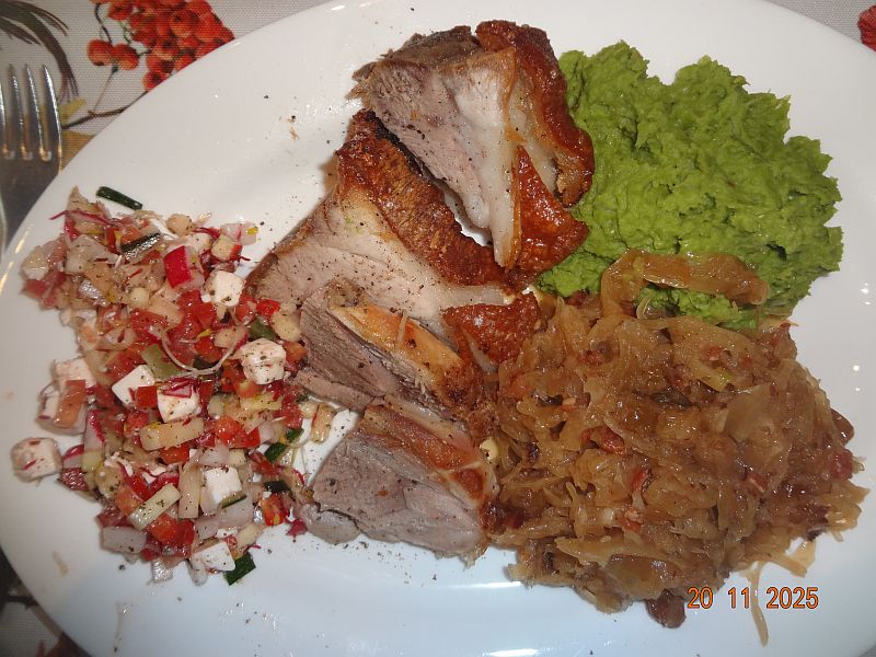 | | Gegrilltes Eisbein, Erbsenpüree, Rumrosinen-Sauerkraut und Gemüsesalat mit Feta |