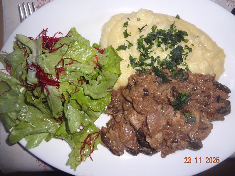 | | Eisbein-Geschnetzeltes mit Pilzen, Kart.-Stampf mit Kohlrabi, Sellerie, Käse, Schmand, Butter und Eigelb, Eichblattsalat mit Rote-Bete-Sprossen |