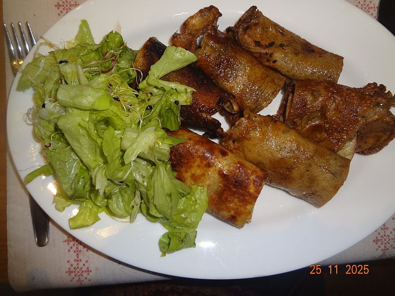 | | Gebratene Hähnchenschenkel, Soße aus Tomaten, Ajvar (mild und pikant), Schmand und Käse, Tagliatelle, Frisée-Salat mit Sprossen |
